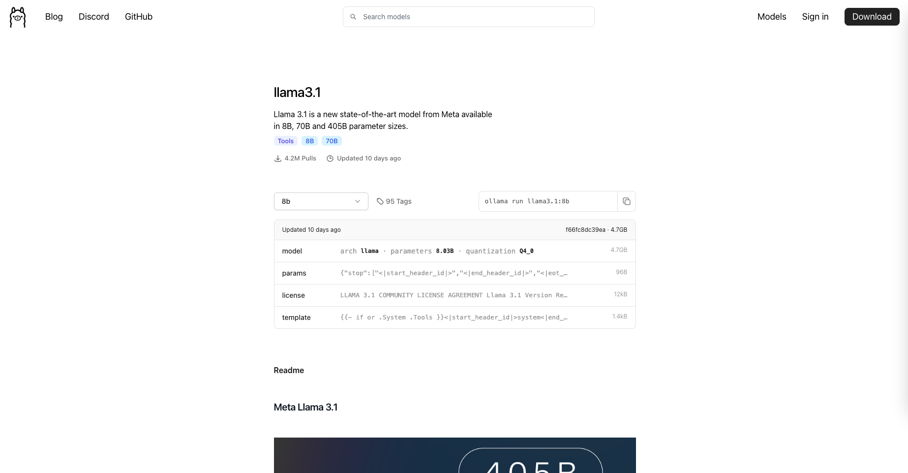 Ollama 설명을 참고해서 3.1을 설치 한다. https://ollama.com/library